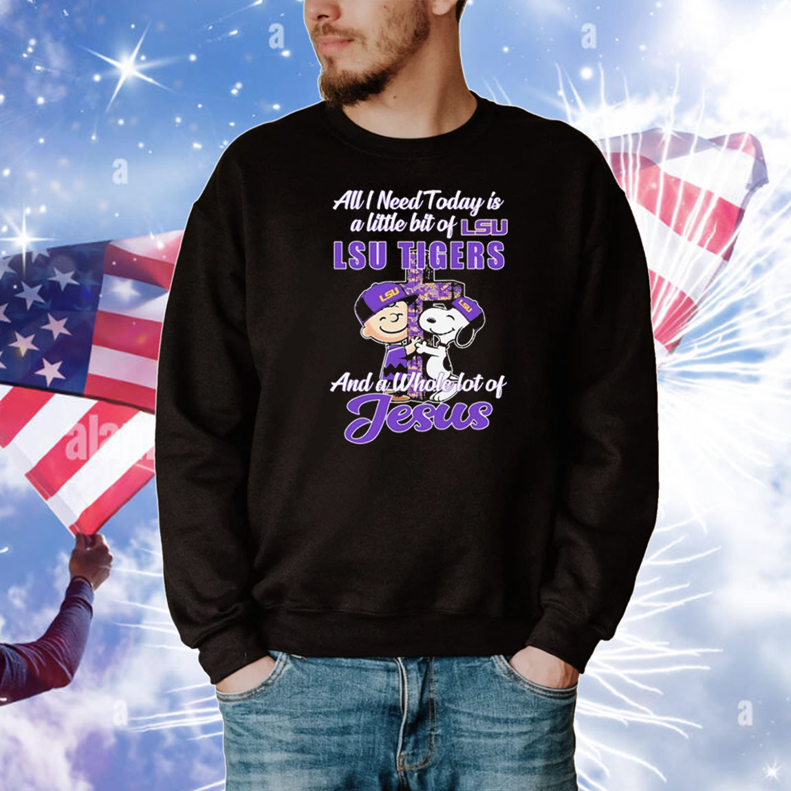 Snoopy And Charlie Brown The Peanuts All I Need Today Is A Little Bit Of Lsu Tigers And A Whole Lot Of Jesus Cross T-Shirt